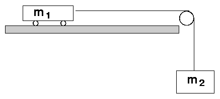Because the two objects are tied together with the same piece of string, the tension T is the same in both. In addition, the magnitude of the two accelerations must be the same. However, note that if the cart goes to the right (in +x direction, so accel ax is positive), then the weight must drop downwards (in -y direction, so accel ay is negative). This means that ax = -ay. Let's replace ay by -ax and solve for the acceleration of the cart.