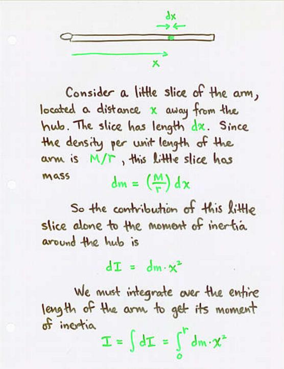 For example, let's consider a long, thin rod of uniform density, with mass M and length r. The rod is is attached to a spinning hub at its left end.