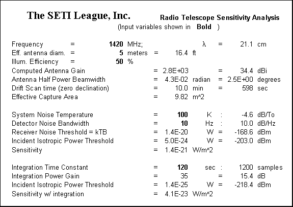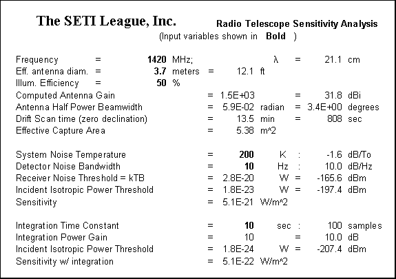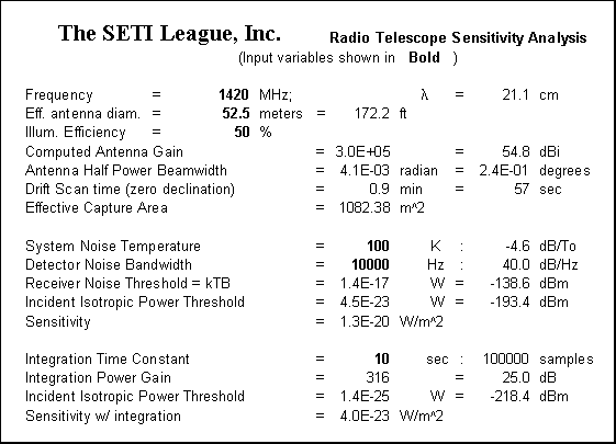 It is reported that when the Wow! signal was intercepted, the gain of the Big Ear radiotelescope was roughly equivalent to that of a circular parabolic reflector 52.5 meters in diameter. [2] Wow! discoverer Jerry Ehman has indicated that the equivalent capture area of the antenna was roughly 1,000 square meters. [3] At the 21 cm operating wavelength, the two figures correlate well if we assume a dish illuminated at roughly 50% efficiency, which is consistent with a feedhorn system designed to minimize sidelobes and antenna noise temperature (see Table 1). The bin bandwidth, noise temperature, and integration time used during reception of the Wow! signal are widely reported in the literature, and are also reflected in Table 1. It can be seen that the resulting sensitivity of the Ohio State Radio Observatory on 15 August 1977 was on the order of 4 x 10-23 W/m^2. The amplitude of the Wow! signal is reported as 30 sigma above receiver background noise, for a SNR of +14.9 dB. The peak of the signal was concentrated in a single channel 10 kHz wide. This suggests that the signal's flux density in a 10 kHz bandwidth was 30 times (4 x 10-23 W/m^2), or 1.2 x 10-21 W/m^2. Thus any SETI instrument with a sensitivity exceeding 1.2 x 10-21 W/m^2 will, in theory, be capable of detecting a repeat of the Wow!, or any similar signal which it should happen to intercept.