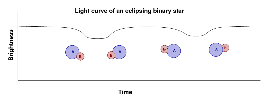 If we measure the light from the system over one full orbital period, then we'll see one dip in the brightness as star B passes in front of A, and then a second dip when A passes in front of B.